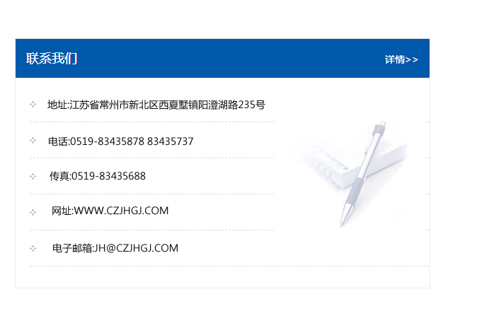 地址:常州市新北區友邦商務大廈1幢16、17層  電話:0519-85101652  傳真:0519-85112595  郵編:213022  網址:www_cz-jiayue_cn.666vote.com  郵箱:xiajifengaa@163.com